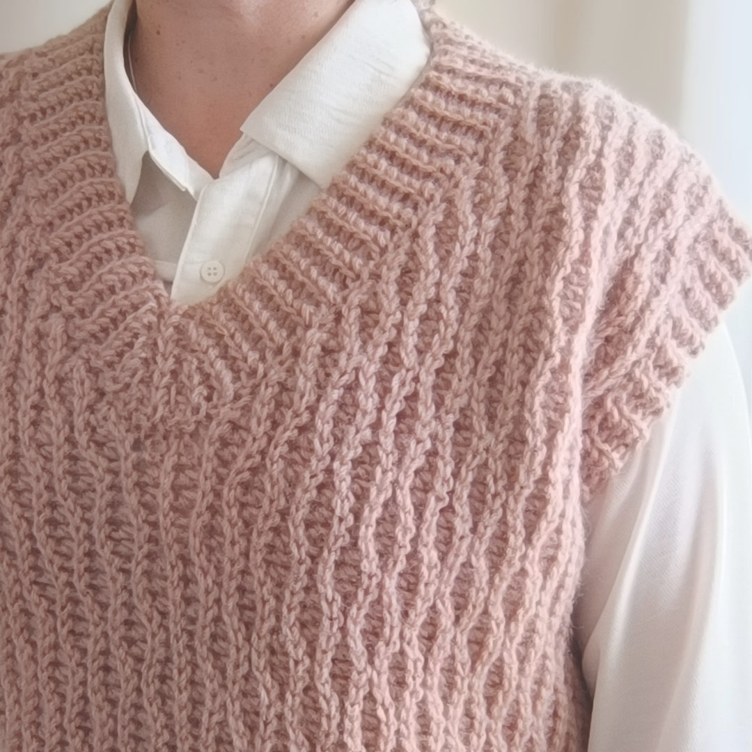 Domina la Técnica de Tejido Vertical y Crea un Chaleco con Cuello en V, terminaciones que imitan el tejido de punto y un Punto Fantasía qué vas a poder aplicar a otros proyectos